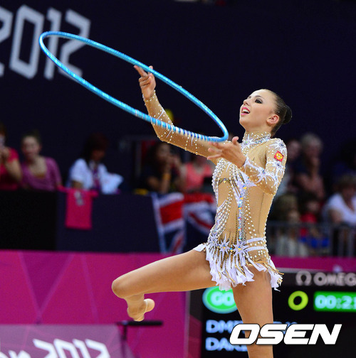 9일(한국시간) 영국 런던의 웸블리 아레나에서 열린 '2012 런던올림픽' 리듬체조 로테이션2에서 러시아 드미트리예바가 후프 연기를 펼치고 있다.