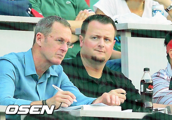 10일 서울 목동구장에서 열린 '2012 팔도 프로야구' 넥센 히어로즈와 한화 이글스의 경기에서 롯데에서 뛰었던 외국인 투수 애킨스(오른쪽)가 보스턴 스카우트로 목동 구장을 찾아 경기를 주시하고 있다.
