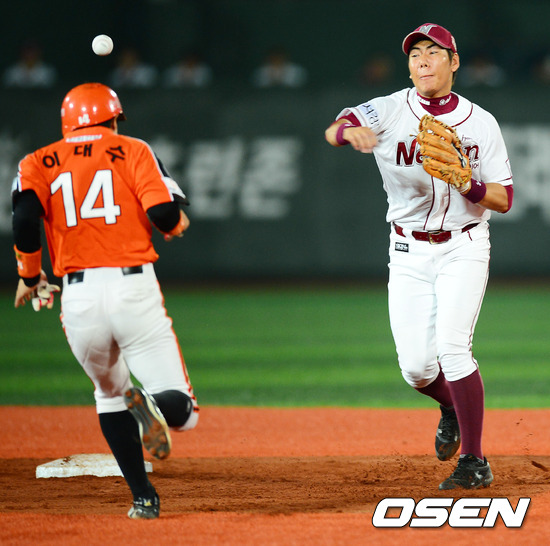 10일 서울 목동구장에서 열린 '2012 팔도 프로야구' 넥센 히어로즈와 한화 이글스의 경기에서 8회초 1사 주자 만루 한화 장성호의 2루수 앞 병살타때 넥센 유격수 강정호가 2루에서 이대수를 포스아웃 시킨 후 1루로 송구하고 있다.