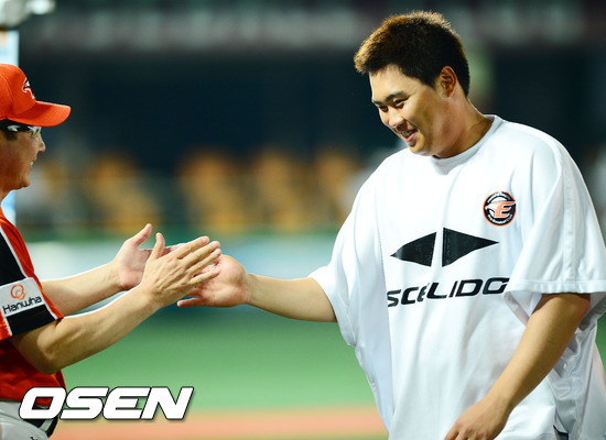경기를 마치고 한화 류현진과 한대화 감독이 웃으며 하이파이브를 하고 있다. / rumi@osen.co.kr