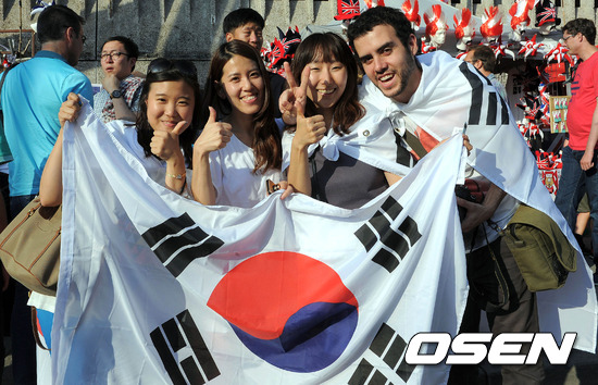 [OSEN=카디프(영국), 올림픽공동취재단] 11일(한국시간) 새벽 영국 카디프의 밀레니엄 스타디움에서 열리는 '숙적' 일본과 2012런던올림픽 남자축구 3~4위 경기 시작 전 팬들이 길거리 응원을 펼치고 있다.