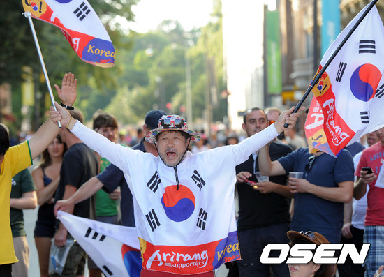 [OSEN=카디프(영국), 올림픽공동취재단] 11일(한국시간) 새벽 영국 카디프의 밀레니엄 스타디움에서 열리는 '숙적' 일본과 2012런던올림픽 남자축구 3~4위 경기 시작 전 팬들이 길거리 응원을 펼치고 있다.