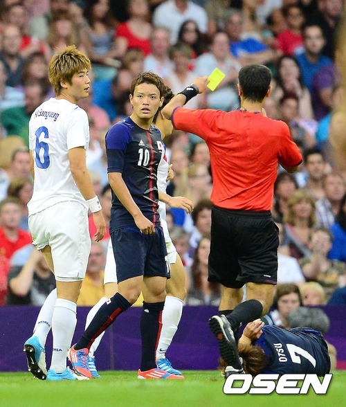 11일(한국시간) 새벽 영국 카디프의 밀레니엄 스타디움에서 열리는 '숙적' 일본과 2012런던올림픽 남자축구 3~4위전 전반 기성용이 옐로우 카드를 받고 있다.