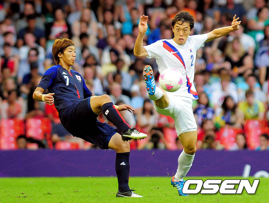 [OSEN=카디프(영국), 올림픽공동취재단] 11일(한국시간) 새벽 영국 카디프의 밀레니엄 스타디움에서 열린 '숙적' 일본과 2012 런던올림픽 남자축구 3~4위 경기 전반 오재석이 볼다툼을 하고 있다.