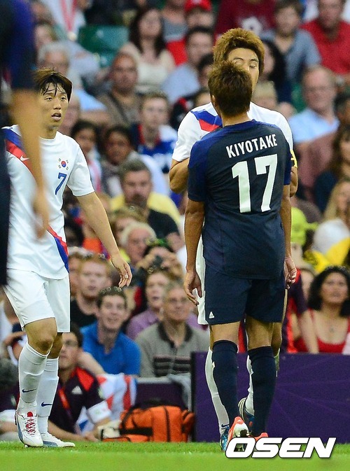 11일(한국시간) 새벽 영국 카디프의 밀레니엄 스타디움에서 열리는 '숙적' 일본과 2012런던올림픽 남자축구 3~4위전 전반 구자철이 일본 기요타케와 충돌하고 있다.