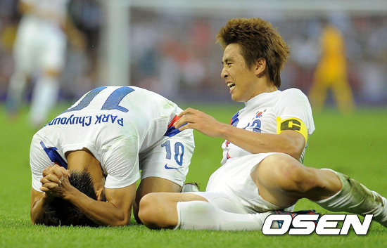 [OSEN=카디프(영국), 올림픽공동취재단] 11일(한국시간) 새벽 영국 카디프의 밀레니엄 스타디움에서 열린 '숙적' 일본과 2012 런던올림픽 남자축구 3~4위 경기 전반 박주영이 골을 넣은 후 구자철과 기뻐하고 있다.