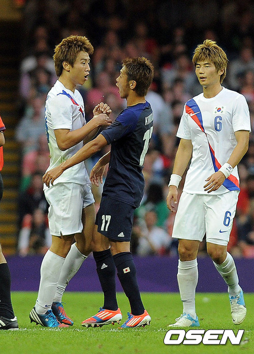 [OSEN=카디프(영국), 올림픽공동취재단] 11일(한국시간) 새벽 영국 카디프의 밀레니엄 스타디움에서 열린 '숙적' 일본과 2012 런던올림픽 남자축구 3~4위 경기 전반 구자철과 키요타케가 말다툼을 하고 있다.