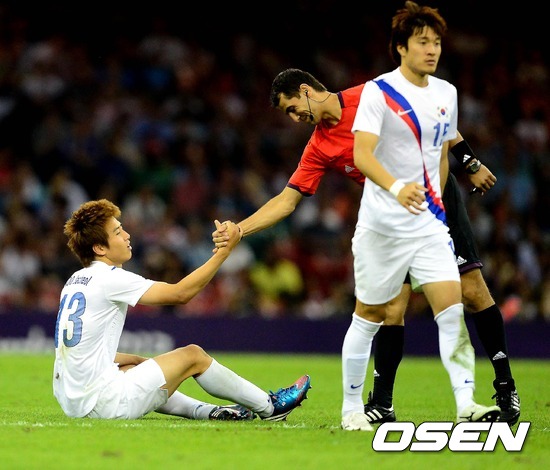 11일(한국시간) 새벽 영국 카디프의 밀레니엄 스타디움에서 열리는 '숙적' 일본과 2012런던올림픽 남자축구 3~4위전 후반 이르마토브 주심이 구자철을 일으켜 세워주고 있다.