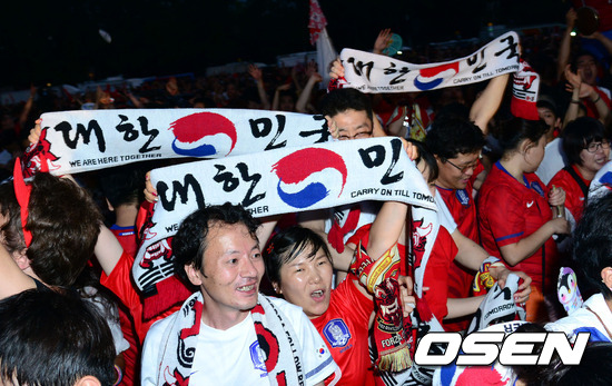 11일 새벽 서울 시청앞 광장에서 축구팬들이 올림픽 축구 대표팀이 승리하자 기뻐하고 있다./ youngrae@osen.co.kr