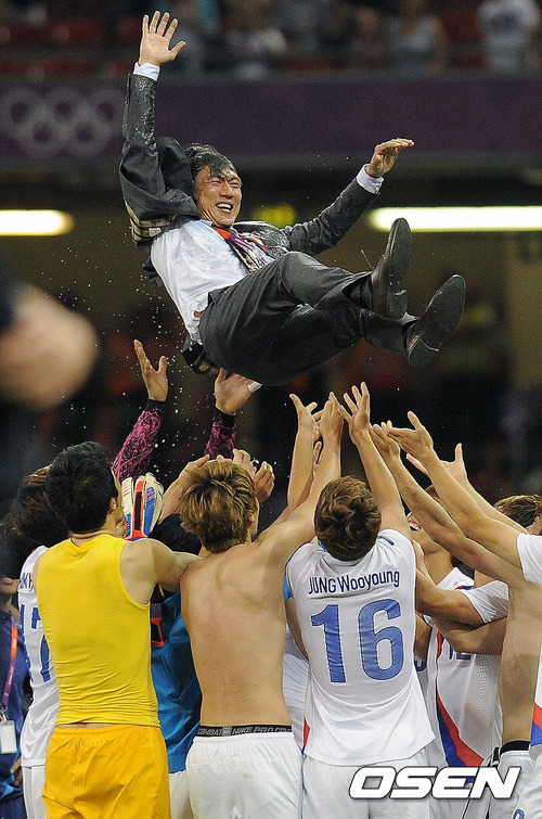 [OSEN=카디프(영국), 올림픽공동취재단] 11일(한국시간) 새벽 영국 카디프의 밀레니엄 스타디움에서 열린 '숙적' 일본과 2012런던올림픽 남자축구 3~4위 경기 종료 후 홍명보 감독이 헹가래를 받고 있다.