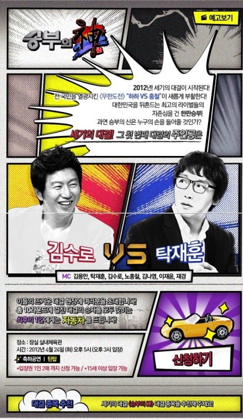 ‘승부의 신’은 ‘무한도전’에서 보여줬던 ‘하하 vs 홍철’ 특집에서 출발, 인기 연예인이 종목을 정해놓고 대결을 펼치면 관객이 승부를 예측하는 구성이다.