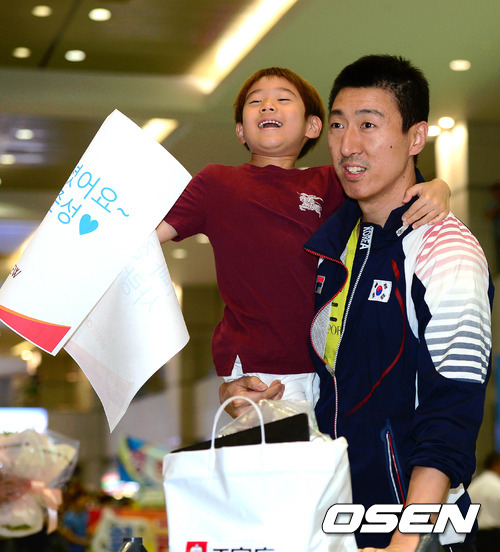 탁구 오상은이 아들의 환영을 받으며 입국장을 나가고 있다. / sunday@osen.co.kr