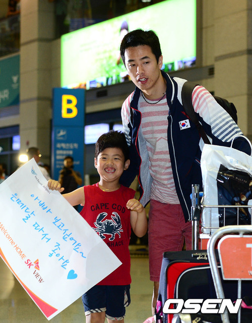 탁구 주세혁이 아들의 환영을 받으며 입국장을 나가고 있다. / sunday@osen.co.kr