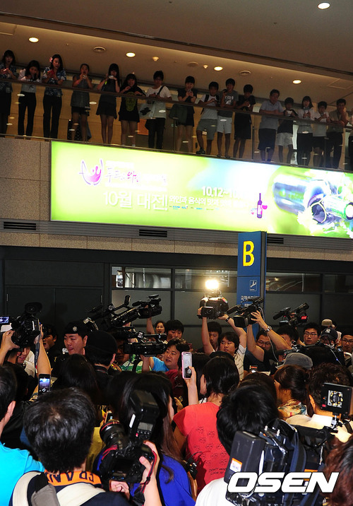 수영 박태환이 팬들과 취재진의 둘러싸여 입국장을 나가고 있다. / sunday@osen.co.kr