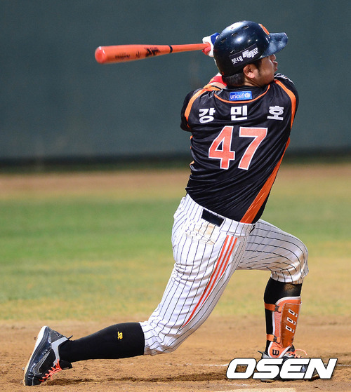 11일 오후 광주구장에서 열린 '2012 팔도 프로야구' KIA 타이거즈와 롯데 자이언츠의 경기 7회초 2사 3루 강민호가 1타점 적시타를 치고 있다.