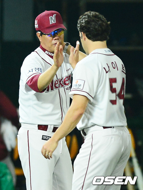 넥센 김시진 감독이 한국 데뷔 후 처음으로 완봉승을 작성한 외국인 에이스 브랜든 나이트(37)를 축하했다.