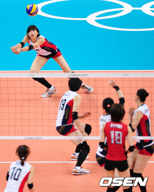 [OSEN=런던(영국), 올림픽공동취재단] 11일 오후(한국시간) 영국 런던 얼스코트에서 열린 여자 배구 3, 4위전에서 대한민국 과 일본의 경기, 대한민국 김연경이 일본의 공격을 받아내고 있다.