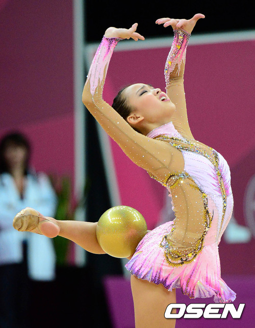 '리듬체조요정' 손연재(18, 세종고)가 11일 오후 (한국시간) 영국 런던의 웸블리 아레나에서 열린 2012 런던올림픽 리듬체조 개인종합 결선에서 볼 연기를 펼치고 있다.