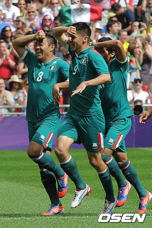 [OSEN=런던(영국), 올림픽공동취재단] 런던 웸블리구장에서 열린 11일 오후(한국 시간) 2012 런던올림픽 남자 축구 결승전 브라질과 멕시코의 경기, 전반 멕시코 페랄타가 선제골을 성공시키고 환호하고 있다.