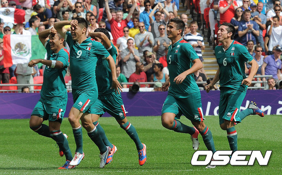 [OSEN=런던(영국), 올림픽공동취재단] 런던 웸블리구장에서 열린 11일 오후(한국 시간) 2012 런던올림픽 남자 축구 결승전 브라질과 멕시코의 경기, 전반 멕시코 페랄타가 선제골을 성공시키고 환호하고 있다.