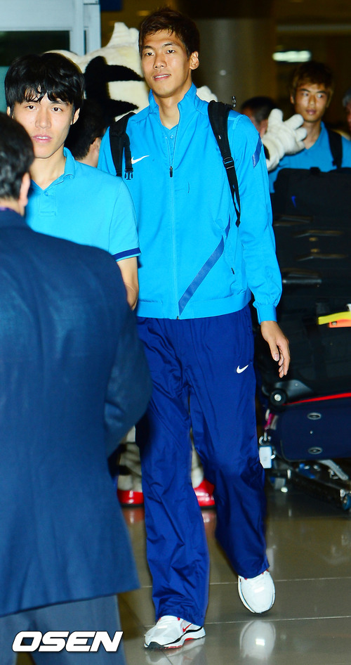 12일 오후 인천공항을 통해 입국한 홍명보 감독이 이끄는 올림픽 축구 대표팀의 이범영이 입국장을 통과하며 미소짓고 있다.