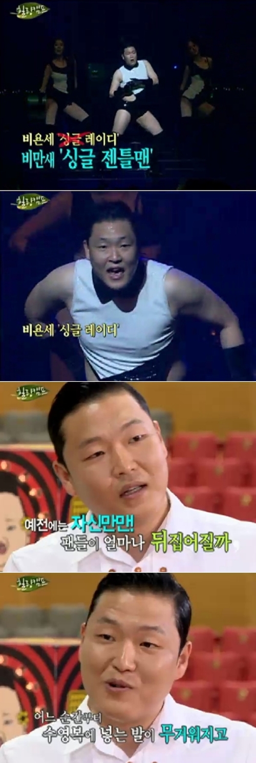 싸이는 13일 오후 방송된 SBS '힐링캠프, 기쁘지 아니한가'에 출연해 "요즘에 철 드는 게 걱정이다"고 밝혔다. 그는 "공연을 할 때마다 여가수 패러디를 하는데 지난 공연에서 비욘세 의상을 입었었다"며 "그 때 허망한 기분이 들었다"고 전했다.