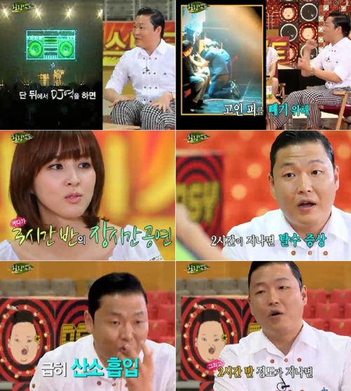 싸이는 13일 오후 방송된 SBS '힐링캠프, 기쁘지 아니한가'에서 공연 중 겪었던 에피소드를 전하던 중 "제가 공연을 한 번 하면 3시간 30분 정도 하는데 2시간 정도가 지나면 탈수 증상이 와서 암전이 됐을 때 산소를 흡입하고 돌아온다. 체력적으로 힘들다"고 말했다.