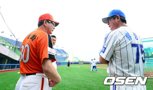 14일 오후 포항구장에서 열리는 2012 팔도 프로야구 삼성 라이온즈와 한화 이글스의 경기에 앞서 한화 한대화 감독이 삼성 류중일 감독과 이야기를 나누고 있다