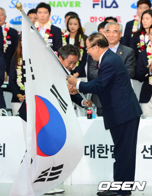 이기흥 선수단장이 해단식 행사에서 단기인 태극기를 박용성 대한체육회 회장에게 건내주고 있다.