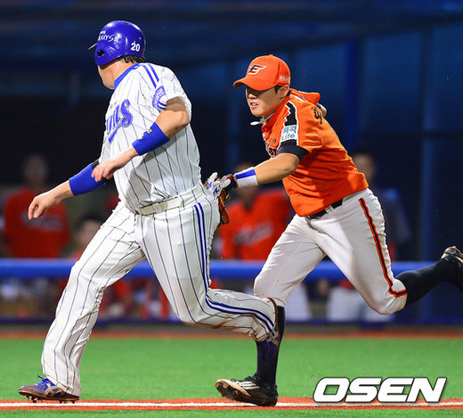 14일 오후 포항구장에서 열린 2012 팔도 프로야구 삼성 라이온즈와 한화 이글스의 경기 6회말 1사 1,3루 김상수의 내야땅볼때 한화 오선진 3루수가 3루 주자 진갑용을 태그아웃시키고 있다.