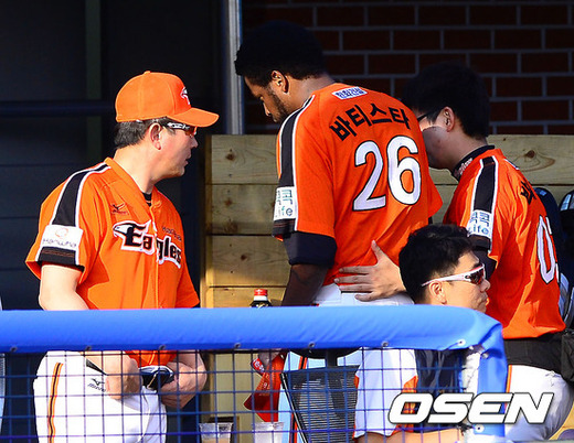 15일 오후 포항구장에서 열린 2012 팔도 프로야구 삼성 라이온즈와 한화 이글스의 경기 2회말 한화 한대화 감독이 부상으로 교체되는 바티스타를 안타까운 표정으로 바라보고 있다.