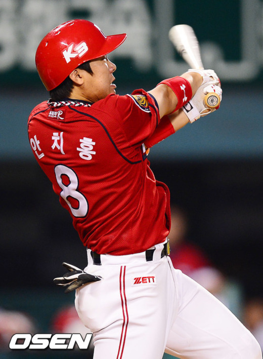 16일 오후 서울 잠실구장에서 열린 '2012 팔도 프로야구' LG 트윈스와 KIA 타이거즈의 경기에서 3회초 2사 주자 2루 KIA 안치홍이 좌익수 왼쪽 동점 1타점 적시타를 날리고 있다.