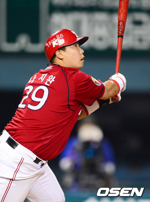 16일 오후 서울 잠실구장에서 열린 '2012 팔도 프로야구' LG 트윈스와 KIA 타이거즈의 경기에서 3회초 2사 주자 2루 KIA 나지완이 우익수 앞 역전 1타점 적시타를 날리고 있다.