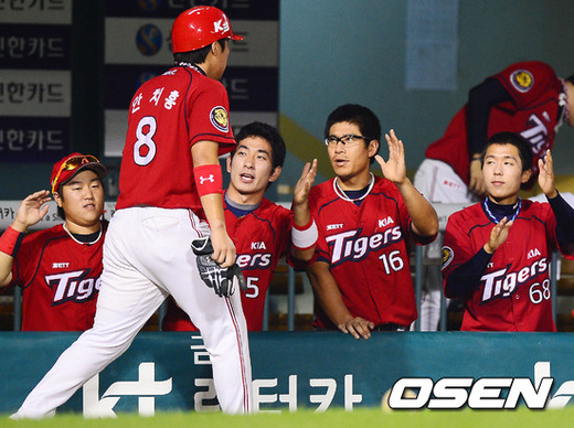 16일 오후 서울 잠실구장에서 열린 '2012 팔도 프로야구' LG 트윈스와 KIA 타이거즈의 경기에서 3회초 2사 주자 2루 KIA 나지완의 우익수 앞 역전 1타점 적시타때 홈을 밟은 안치홍이 덕아웃에서 동료들과 기쁨을 나누고 있다.