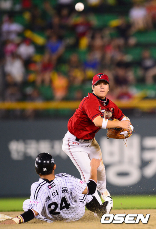 16일 오후 서울 잠실구장에서 열린 '2012 팔도 프로야구' LG 트윈스와 KIA 타이거즈의 경기에서 3회말 무사 주자 1,3루 LG 윤요섭의 2루수 앞 병살타때 KIA 유격수 김선빈이 2루에서 정의윤을 포스아웃 시킨 후 1루로 송구하고 있다.