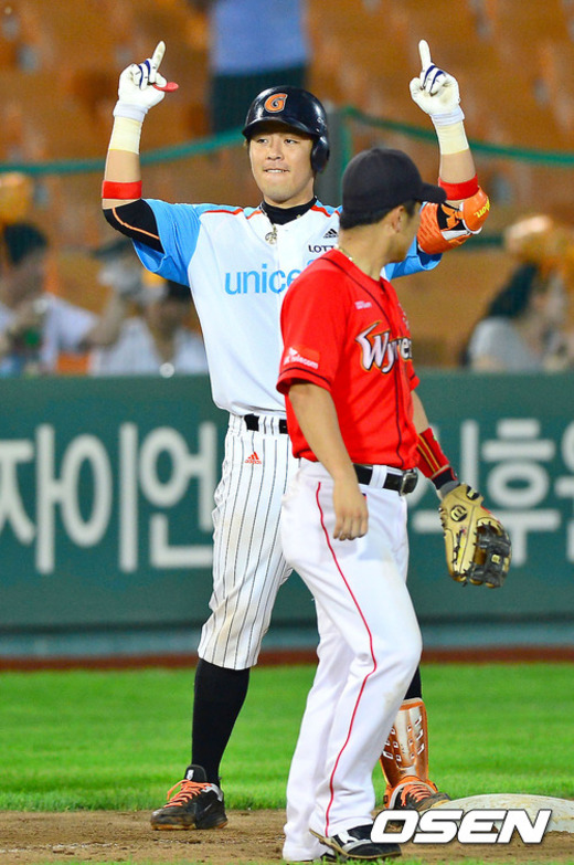 16일 오후 부산 사직구장에서 열린 2012 팔도 프로야구 롯데 자이언츠와 SK 와이번스의 경기 7회말 2사 1,2루 롯데 강민호가 역전 2타점 적시타를 날리고 환호하고 있다.