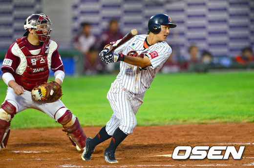 17일 오후 부산 사직구장에서 열린 2012 팔도 프로야구 롯데 자이언츠와 넥센 히어로즈의 경기 2회말 2사 1루 롯데 황진수가 안타를 날리고 있다. 황진수는 이날 1군 복귀했다.