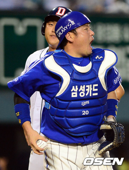 18일 오후 서울 잠실구장에서 열린 '2012 팔도 프로야구' 두산 베어스와 삼성 라이온즈의 경기 7회말 1사 2,3루 최주환의 내야땅볼 상황, 진갑용이 홈으로 쇄도하던 3루주자 오재일을 태그아웃 시킨 후 환호하고 있다.