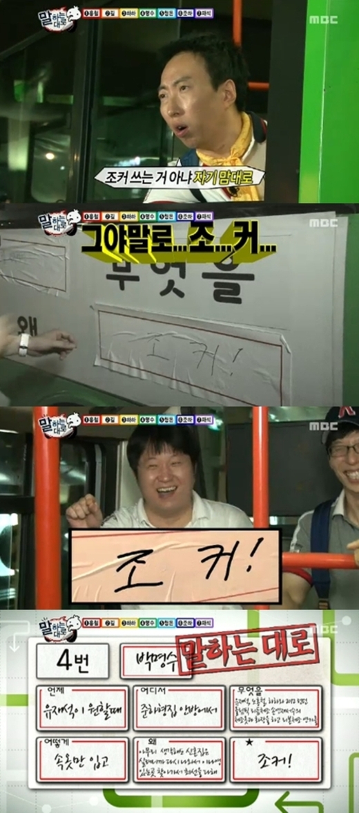 18일 오후 방송된 '무한도전'은 '말하는 대로' 2탄으로 꾸며졌다. 지난주 진행된 러시안룰렛 게임 탈락 순서로 각자 버스를 배정받은 '무한도전' 멤버들은 이날 육하원칙에 의거해 문장을 완성하는 미션을 수행했다. 버스 옆에 부착된 빈칸 7개가 완성되면 각 멤버들은 그 문장이 '말하는 대로' 벌칙을 받는 형식이다.