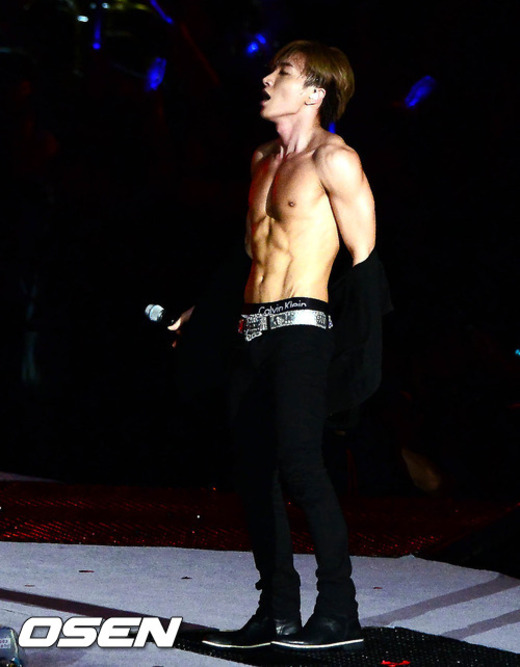 그룹 슈퍼주니어의 이특이 SM 월드투어 콘서트에서 탄탄한 복근을 과시하는 화끈한 팬서비스를 했다.