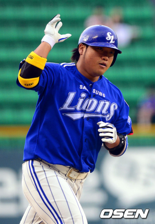 19일 오후 서울 잠실구장에서 열린 '2012 팔도프로야구' 두산 베어스와 삼성 라이온즈의 경기, 1회초 1사 1루 삼성 박석민이 2점 홈런을 치고 그라운드를 돌고 있다.