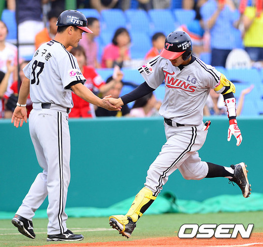 19일 오후 대전구장에서 열린 2012 팔도 프로야구 한화 이글스와 LG 트윈스의 경기 2회초 LG 선두타자 정성훈이 선취 솔로홈런을 날리고 송구홍 3루 코치와 하이파이브를 하고 있다