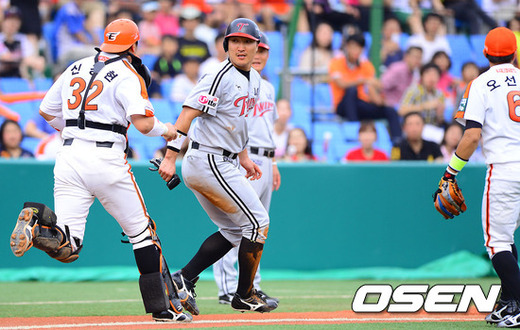 19일 오후 대전구장에서 열린 2012 팔도 프로야구 한화 이글스와 LG 트윈스의 경기 2회초 1사 2,3루 LG 윤요섭의 내야땅볼때 3루 주자 이진영에 협살에 걸려 태그아웃되고 있다