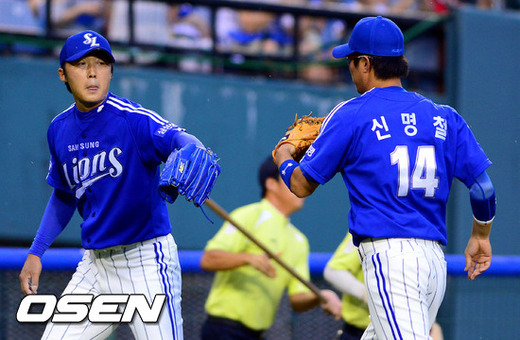 19일 오후 서울 잠실구장에서 열린 '2012 팔도프로야구' 두산 베어스와 삼성 라이온즈의 경기, 3회말 삼성 배영수가 멋진 호수비를 펼친 신명철과 하이파이브를 하고 있다.