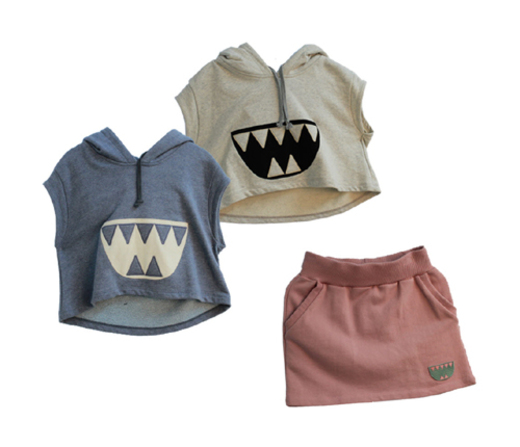 이 제품은 상의 탑이 후드 스타일로 귀엽고 기장이 숏하면서도 중앙부 이빨 캐릭터가 돋보이는 루스핏 스타일이 특징.화이트. 네이비 블루 컬러 2종으로 출시, 같은 면 소재의 팬츠 혹은 스커트와도 매치가 가능하다. 화사한 핑크 트레이닝 스커트는 큐트 스타일의 완성도를 한층 높여줄 아이템.