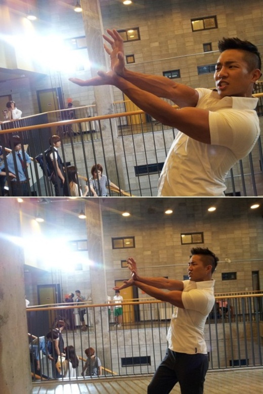 사진 속 상추는 촬영장 조명을 이용해 마치 만화 '드래곤볼'의 손오공이 에네르기파를 쏘는 듯한 포즈를 지어보여 웃음을 자아낸다. 상추의 뒤편에는 남자 교복을 입은 설리가 촬영 준비에 한창이다.