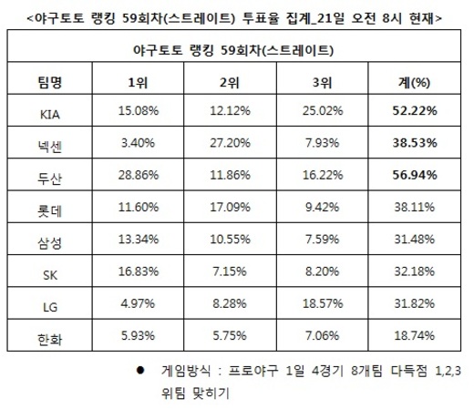 한편, 순위에 상관없이 다득점 3개팀을 맞히는 '박스' 게임에서는 LG(18.43%), 롯데(16.86%), 삼성(15.45%)이 가장 많은 득점을 기록할 것으로 집계됐다. 다득점 가능성 하위 예상팀으로는 SK(9.07%)와 두산(6.34%)이 꼽혔다.