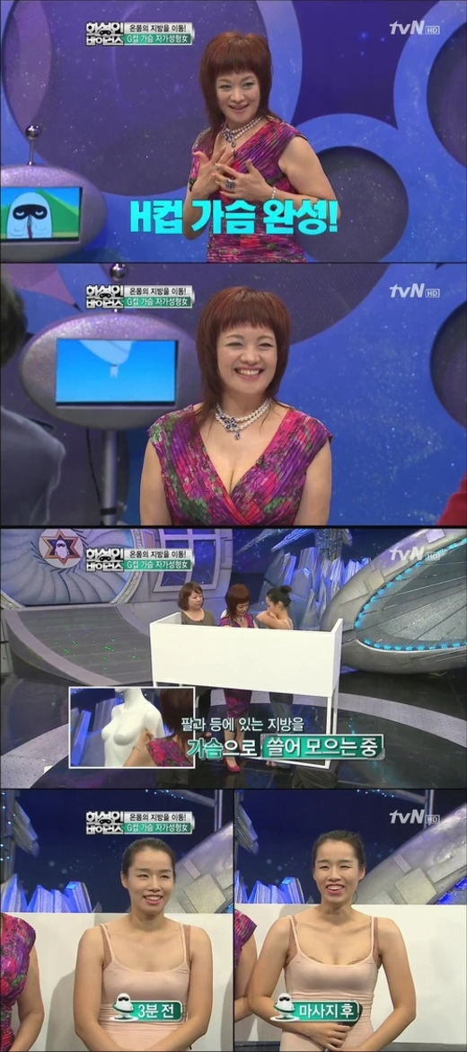 tvN '화성인 바이러스'에 출연한 요시마로 미에코 씨가 마사지로 체내 지방을 이동시켜 A컵 가슴을 G컵으로 확대시킬 수 있다고 주장했다.