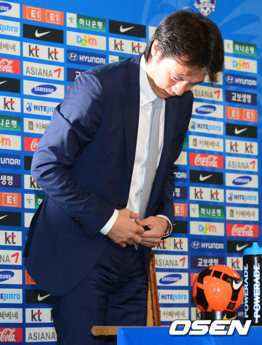 홍명보 감독이 기자회견을 마치고 인사를 하고 있다.