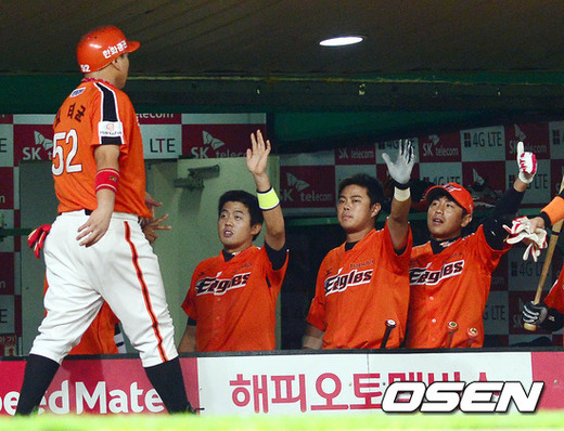 22일 오후 인천 문학구장에서 열린 '2012 팔도 프로야구' SK 와이번스와 한화 이글스의 경기 6회초 1사 2,3루 김경언의 2타점 2루타에 홈을 밟은 3루주자 김태균이 덕아웃에서 동료들과 하이파이브를 하고 있다.
